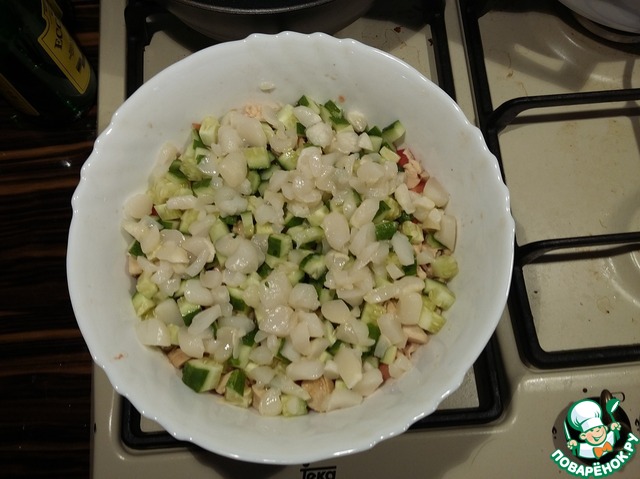 Закладываем ещё один слой огурца и сверху слой гребешка. Опять заправляем.