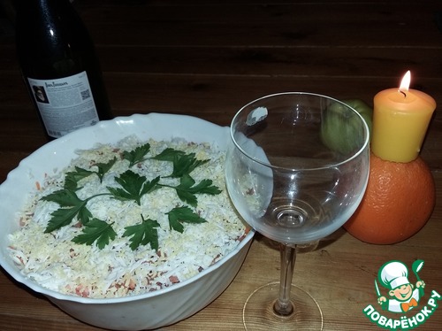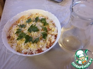 • Сверху натираем на мелкой терке вареные яйца и украшаем зеленью. Отправляем в холодильник до остывания. Ну, примерно на 1 -1,5 часа.