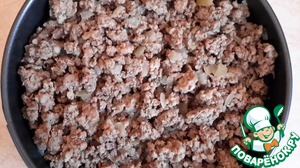 Пока яйцо "схватывается", обжариваем на сковороде фарш с луком, соль, перец по вкусу. Выкладываем готовый фарш на "схватившееся" яйцо.
