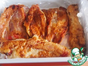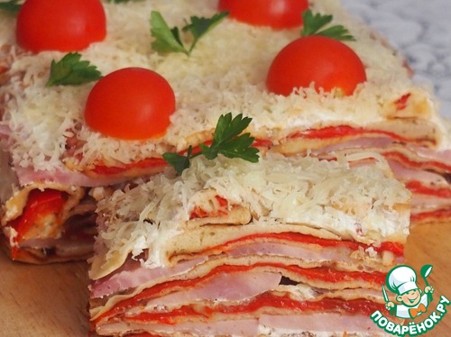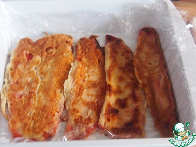 Последним слоем должны идти перцы. Тортик поставить на некоторое время в холодильник, чтобы слои улежались.