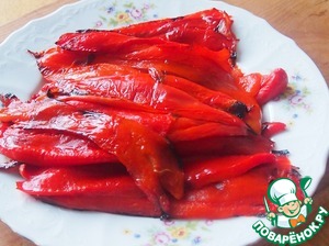 Перец помыть, разрезать пополам, удалить сердцевину и запечь в духовке при температуре 180 градусов до тех пор, пока на них не появятся "волдыри" и краешки начнут чернеть. Готовые перцы сложить в миску, накрыть полотенцем и оставить на несколько минут, потом снять с них кожицу. Таких 20 половинок тонконосых перцев еле-еле помещается на противень. Если вы будете делать этот тортик из крупного мясистого перца, то лучше его запечь целиком и очистить, предварительно сложив на несколько минут в целлофановый пакет, а уже потом разрезать пополам и удалить семена.