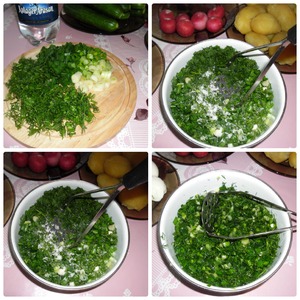 Мелко нарежьте зеленый лук и укроп и сложите в отдельную чашечку. Хорошо посолите смесь укропа и зелёного лука, помните смесь мялкой. И пусть пока постоит.
