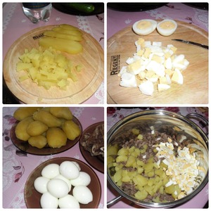 Отварите яйца, картофель в мундире и мясо. При варке яиц добавьте в воду соль, тогда яйца потом будут хорошо и легко чиститься.