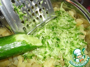 К нарезанным яйцам, мясу и картофелю потрите на крупной тёрке огурцы.