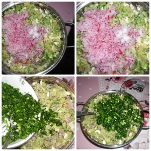 Если пока кушать окрошку не собираетесь, то кастрюльку с нарезанными продуктами можно убрать в холодильник.