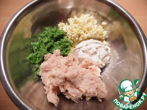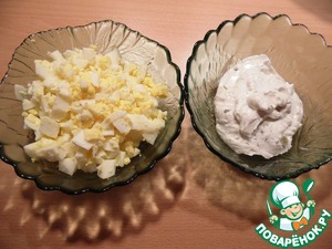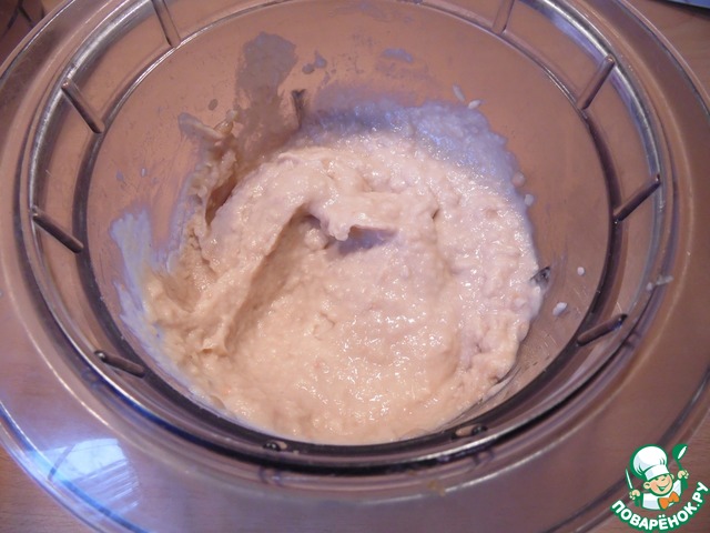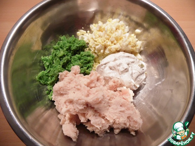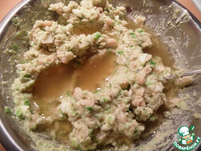 Смешать гороховое и фасолевое пюре, сыр, яйца.
