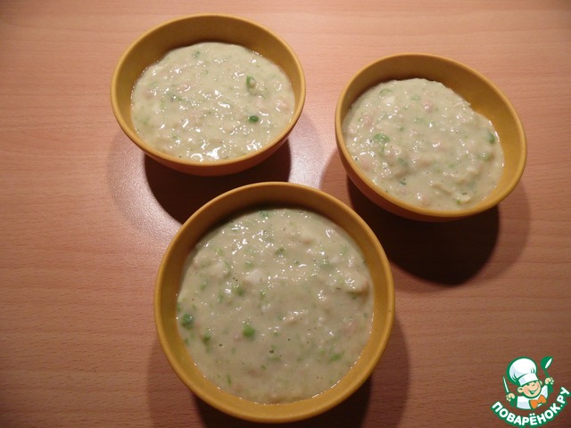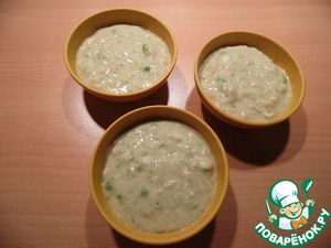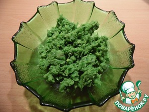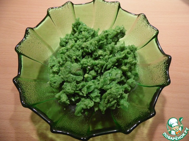 Зеленый горошек бланшировать в подсоленной воде 3-4 минуты, пюрировать.