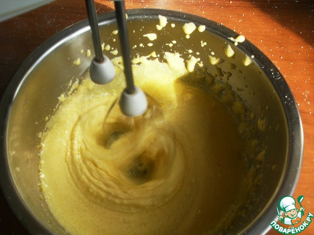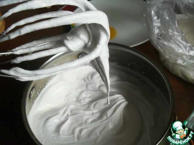 • Взбить белки с сахаром. При взбивании можно добавить несколько капель лимонного сока. Белки взбить до острых пиков."Стоячее" состояние белков нам не нужно, это не меренга. Если долго будете взбивать, то потом они расслоятся и их останется просто выбросить.