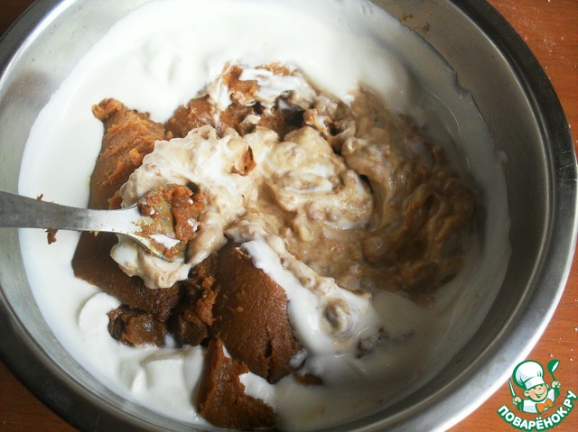 • Пока коржи пекутся, сделаем крем. Соединим сметану со сгущенным молоком. Можно вместо сметаны взять и масло. Но в тесте достаточно жира.
