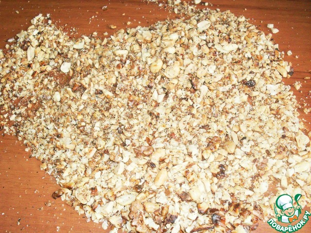 • Орехи, если не жаренные-обжарить. Если жаренные-немного подсушить на сковородке и измельчить скалкой. У меня были пополам грецкие и арахис.