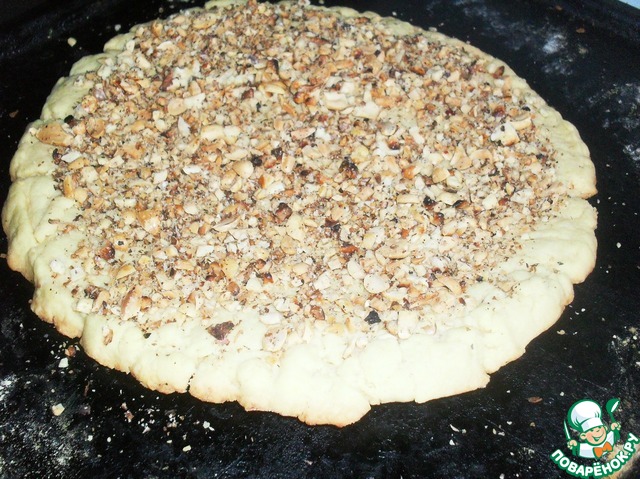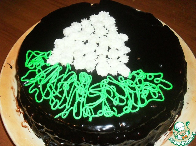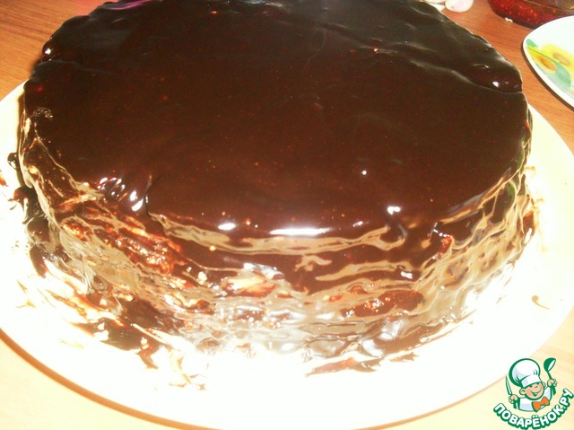 • Готовый корж посыпать дробленными орехами и сверху выложить глазурь.