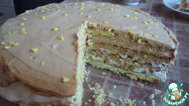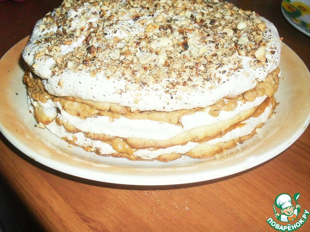 • Каждый корж промазываем кремом. Сверху корж без безе. Вы заметили, что в тесто не кладем ни соду, ни разрыхлитель?