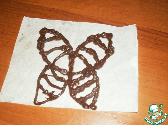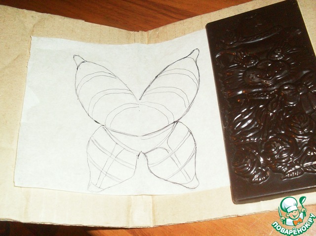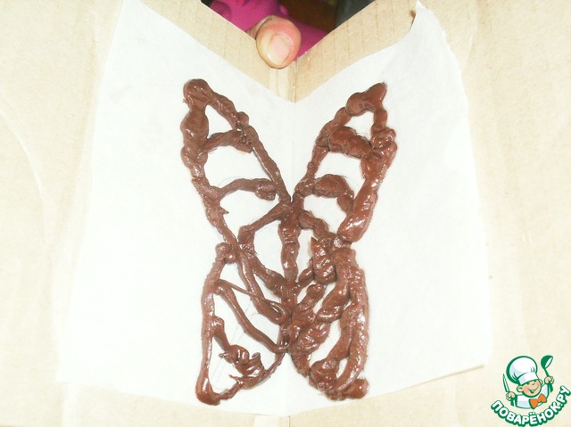 • Шоколад растопите удобным вам способом. Сверните из еще одного листочка пергамента корнетик. На кальке нарисуйте бабочку, она должна быть симметричной. Положите шоколадную массу в корнетик и рисуйте бабочку.