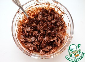 Кукурузные хлопья добавить к растопленному шоколаду и перемешивать до тех пор, пока хлопья не будут полностью покрыты шоколадом. Если хлопья очень большие, можно немного их измельчить. Форму обтянуть пищевой пленкой. У меня прямоугольная форма размером 20 на 15. Выложить хлопья и равномерно распределить по всей поверхности, поставить в холодильник на несколько часов, пока хлопья не затвердеют.