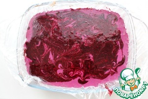 Выложить поверх кукурузно-шоколадного слоя, тщательно распределив по всей поверхности. Выложить оставшуюся часть ягодного пюре и вилкой по желанию сделать узоры.