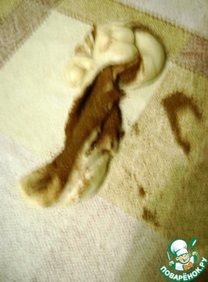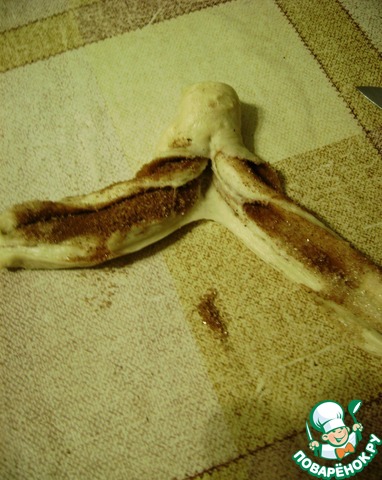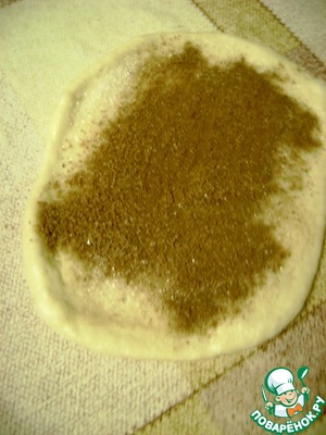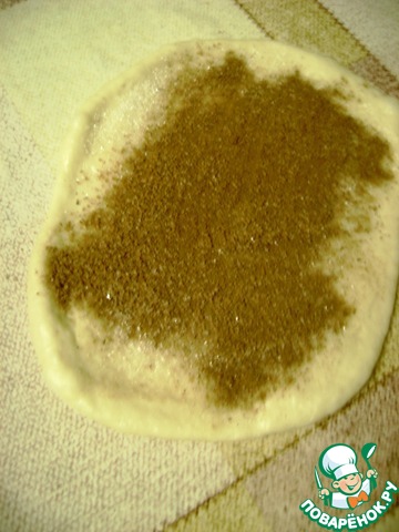Готовое тесто разделить на небольшие кусочки, раскатать кусочек в лепешку и обильно посыпать сахаром и корицей-практически сплошным слоем.