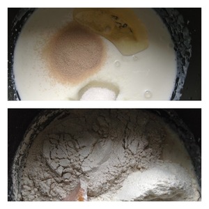 Кефир разогреть, всыпать дрожжи, соль, сахар и масло. Перемешать. Всыпать оба вида муки и замесить тесто.