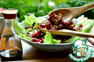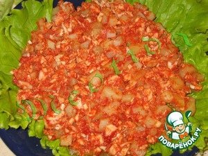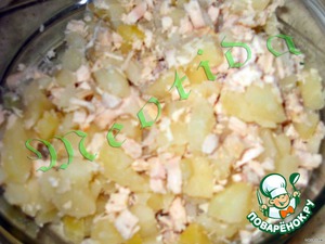 Курицу с картошкой заправить смесью пасты с хреном, добавить измельченный чесночок (можно посолить и поперчить по вкусу, но я этого не делала), выложить слоем на листья салата