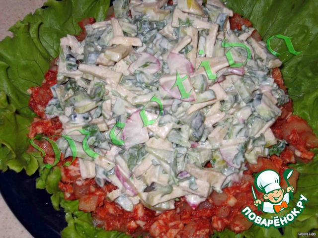 Сытный, необычный и очень вкусный салатик, состоящий из двух слоев с разными заправками: нежное куриное филе и картофель с заправкой из хрена, томатной пасты и чесночка; свежие овощи (редис, огурец) и фрукты (яблочко) с заправкой из сметанки, горчицы и кинзочки. Под легкой шапкой из вареного яйца... Быстро, вкусно, необычно!