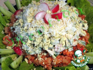 Сверху посыпать тертым на мелкой терке яйцом и украсить на Ваш вкус (у меня времени было немного, поэтому особенно украшать было некогда, НО на вкусе салата это никак не отразилось и выглядел он очень необычно из-за того, что слои с разными заправками)