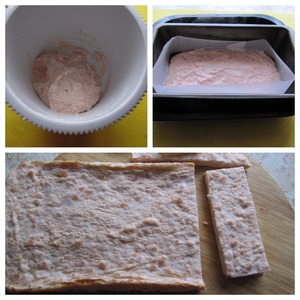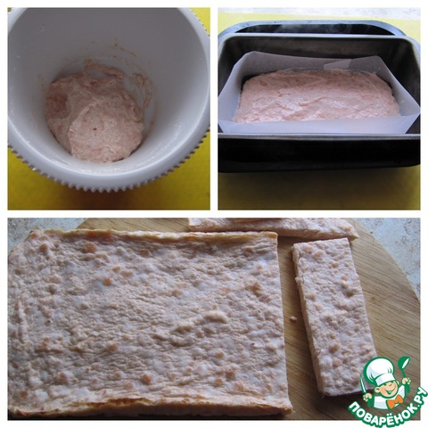 Для приготовления закуски вырезать полоску желе, на нее выложить полоску запеченного мусса, сверху накрыть полоской желе. Подавать охлажденным!