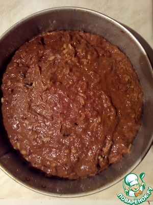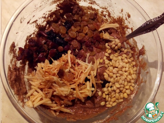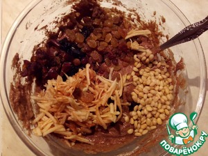 В тесто добавляем сухофрукты, орехи и натертое яблоко. Все размешиваем. -
