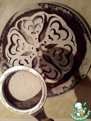 Кладем трафарет на остывший кекс и посыпаем сахарной пудрой.