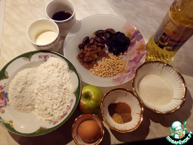 Духовку разогреть до температуры 180 градусов. Сухофрукты хорошо промыть, обсушить, крупно порезать. Яблоко натереть на крупной терке.