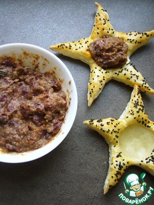 Вы можете намазать тапенад на любой хлеб или на любые другие тарталетки, но так как у нас конкурс ко "Дню защитника отечества", я конечно оформила их из слоеного теста в виде звезд. И подавать их с боевой песней к столу)))