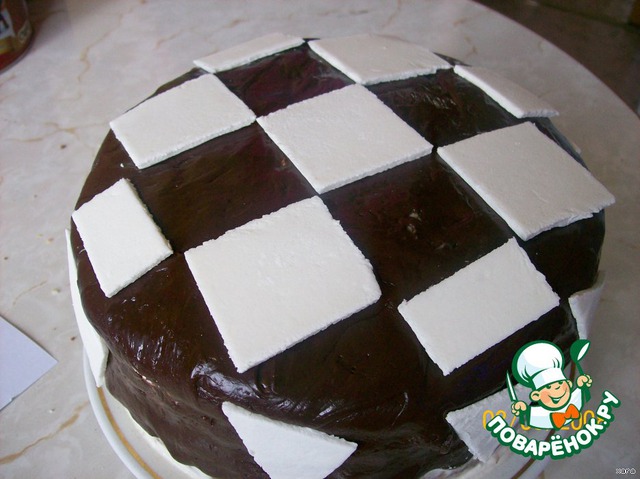 • Если к этому времени глазурь на торте успела полностью застыть, нижнюю сторону квадратиков можно слегка смазать теплой водой для лучшего склеивания поверхностей.