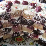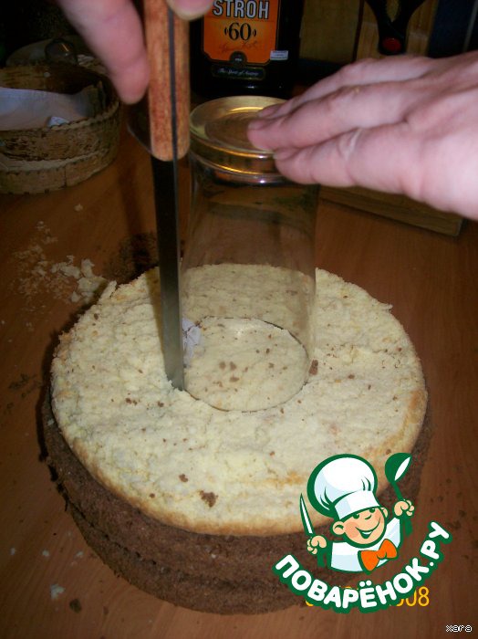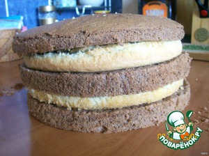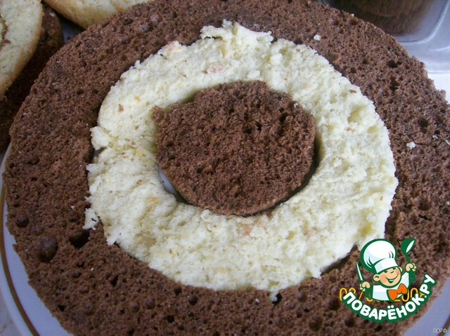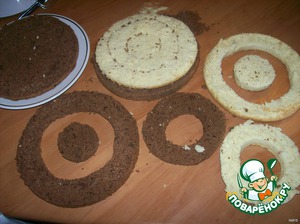 • Собрать коржи, чередуя кольца по цвету. Получится 2 коржа с темным внешним краем, 2 - со светлым. промазать все довольно толстым слоем крема и убрать на время в холодильник.