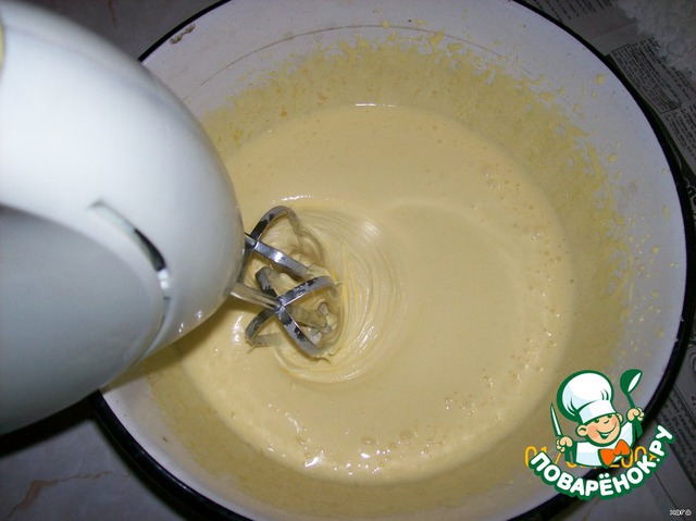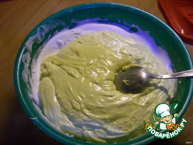 • На белковую массу высыпать оставшуюся муку ровным слоем, сверху выложить желтковое тесто и осторожненько перемешать опять таки круговыми движениями снизу вверх, не торопясь, чтобы тесто не опало.