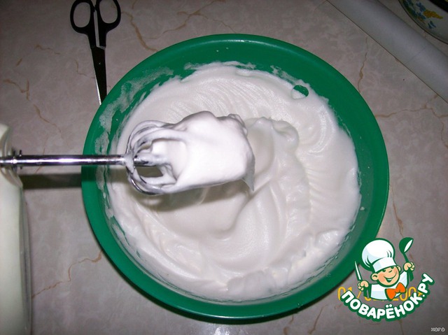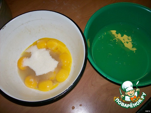 • Белки взбить венчиком до крепкой пены, добавить оставшийся сахар и взбивать до растворения сахара.