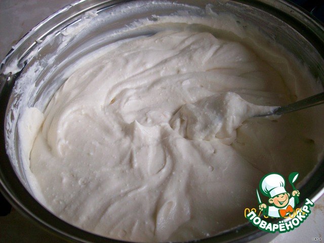• [b]Готовим крем:[/b] творог отжать от излишней сыворотки, протереть через сито, добавить сахар. Ванилин растворить в коньяке и тоже вылить в творог, тщательно все перемешать. Взбить сливки до "стоячего" состояния, добавить закрепитель, осторожно подмешать к творогу.