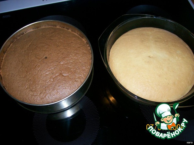 • После выпечки дать бисквитам остыть в форме, вынуть и разрезать каждый на 2 одинаковых пласта.