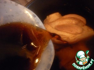 Залить квасом и водой, чтобы они покрывали рульку. Отварить 1,5часа. ( я все эти процессы делала в мультиварке-скороварке, поэтому время у меня заняло в 2 раза меньше). Слить бульон и сохранить. Рульку немного остудить.