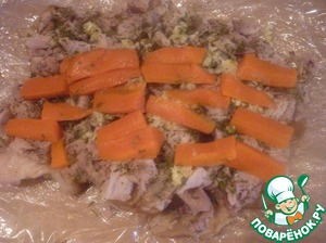 Разрезать рульку вдоль и, сохраняя шкуру, вынуть кости и бОльшую часть мяса. Расстелить пищевую плёнку, разложить шкуру и мясо поверх неё. Посыпать зеленью и измельчённым чесноком. Нарезать брусочками отварную морковь и выложить её сверху.