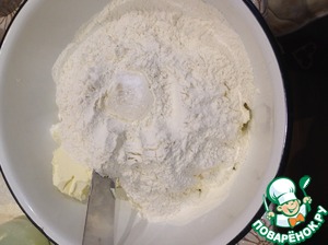 • В миску - мука, творог, масло сливочное, сода гашеная уксусом. Сечь ножом в крошку.