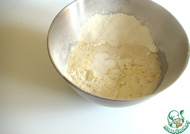 В чашу миксера добавить просеянную муку, семолину (манку), соль, влить дрожжевую смесь, оливковое масло. Замесить тесто.