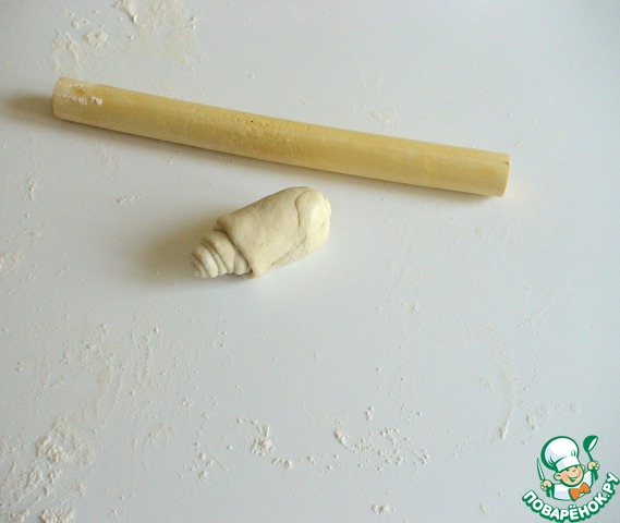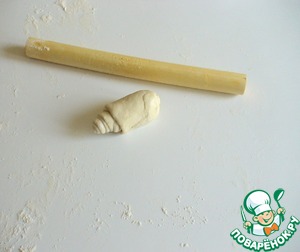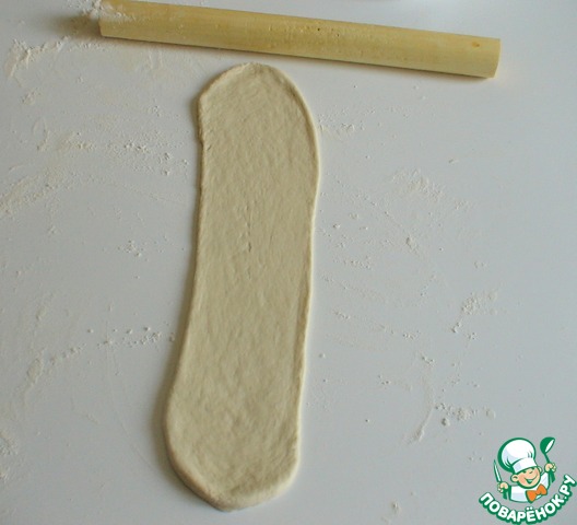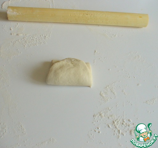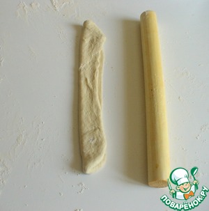 Теперь эту полоску раскатать очень тонко и скатать в рулетик.