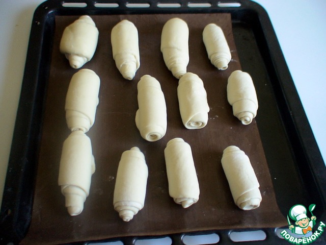 Противень смазать маслом, или застелить пергаментной бумагой, выложить получившиеся рогалики, взять второй противень сбрызнуть его очень хорошо водой, накрыть противень с булочками. Поставить на расстойку на 1 час