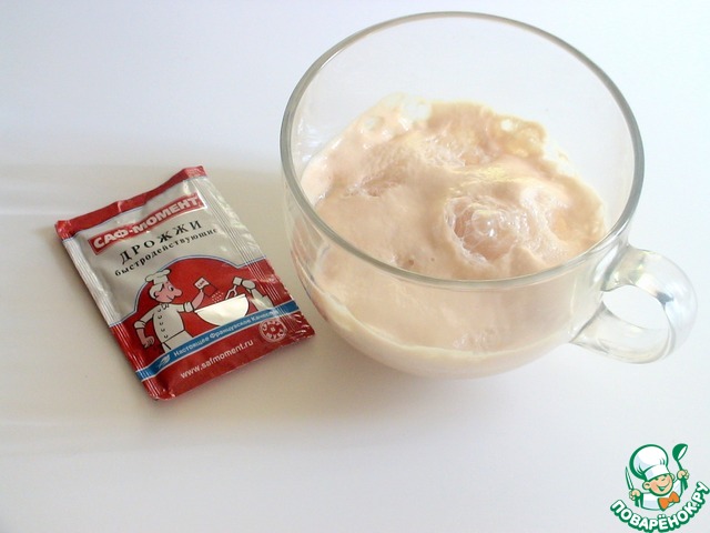 Активизировать дрожжи, смешать дрожжи с сахаром, влить воду, перемешать, поставить в теплое место на 30 минут