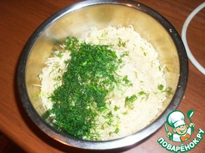 Пока тесто замешивается, приготовим начинку. Сыр трем на терке со средними ячейками. Чеснок пропустить через пресс. Укроп мелко нарезать. Все аккуратно перемешать.