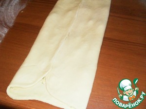 Сложить края теста к центру по длинной стороне. Всю площадь промазать смальцем.