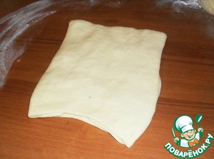 Готовое тесто разделить на 5 кусочков (я брала продукты для теста в 1,5 раз больше). Каждый раскатать в прямоугольник и посыпать начинкой.