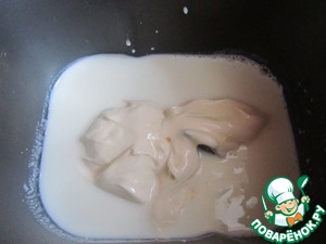 В чашу хлебопечи вылить кефир и плавленый сыр
