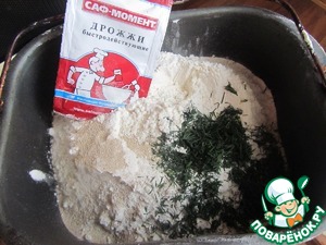 Добавить соль, сахар, муку, измельченную зелень укропа (можете использовать любую зелень по вашему вкусу), измельченный чеснок и дрожжи Саф - момент. Отправляем в хлебопечку.