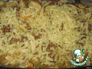 Нафаршировать их фаршем, сложить в смазанную маслом форму, залить соусом, посыпать тертым сыром.