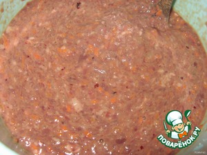 Куриные потрошки вместе с луком и морковью пропустить через мясорубку, посолить, поперчить, хорошо перемешать.