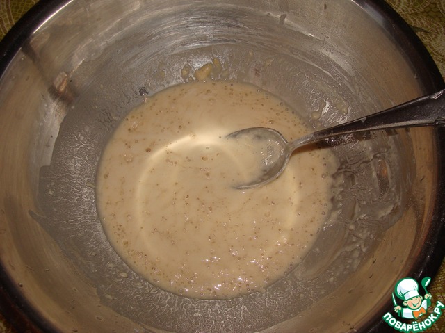 Подогреть немного отвар, влить в миску 200мл, добавить сахар, дрожжи и 1 ст. л. муки. Отправить в теплое место на 15 минут. Должна получиться шапочка, как на фото.